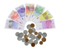 Juego de dinero de euros para que los niños se familiaricen con las monedas y billetes. El juego incluye 24 monedas de 1 céntimo a 2€ y 70 billetes de 5€ a 500€. Una billete mide unos 9cm de largo y la moneda de 2€ tiene un diámetro de 2cm. Apto para niñ@s a partir de 3 años.